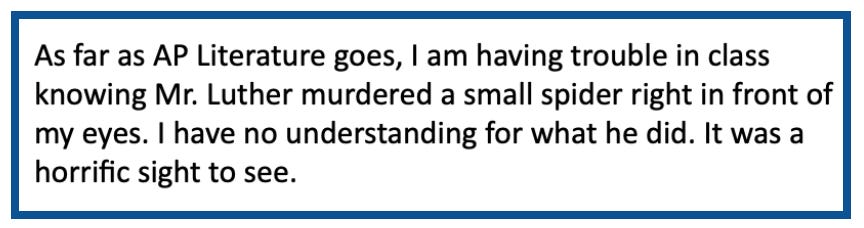 And to think: all of this took place because a student in another class the week before had alerted Mr. Luther about a spider on the floor—a poor spider that had no idea it was going to become a classroom legend.