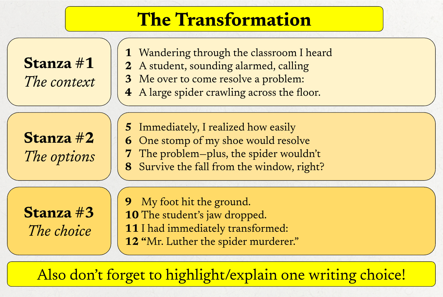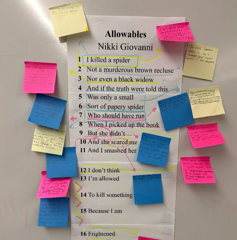 For any English teacher reading this post, I imagine you might have guessed that this pivot was coming—just as about 5 seconds after the “spider murder” took place I realized that “Allowables” by the late, legendary Nikki Giovanni was now inevitably going to be centered in our classroom.