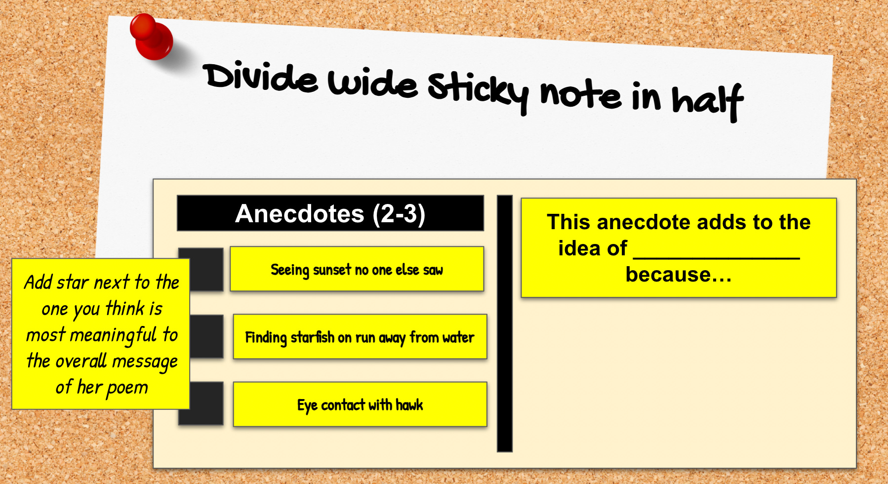 First we took down a definition of anecdote and discussed how great storytellers weave in anecdotes to help convey that “underneath” they want to be understood. Then—using the anecdote-framing pictured above on another sticky note—we twice watched through Kay’s “Miles from Any Shoreline,” taking note of the different anecdotes brilliantly woven within it (first watch) and considering the way they serve her story’s “underneath” (second watch).