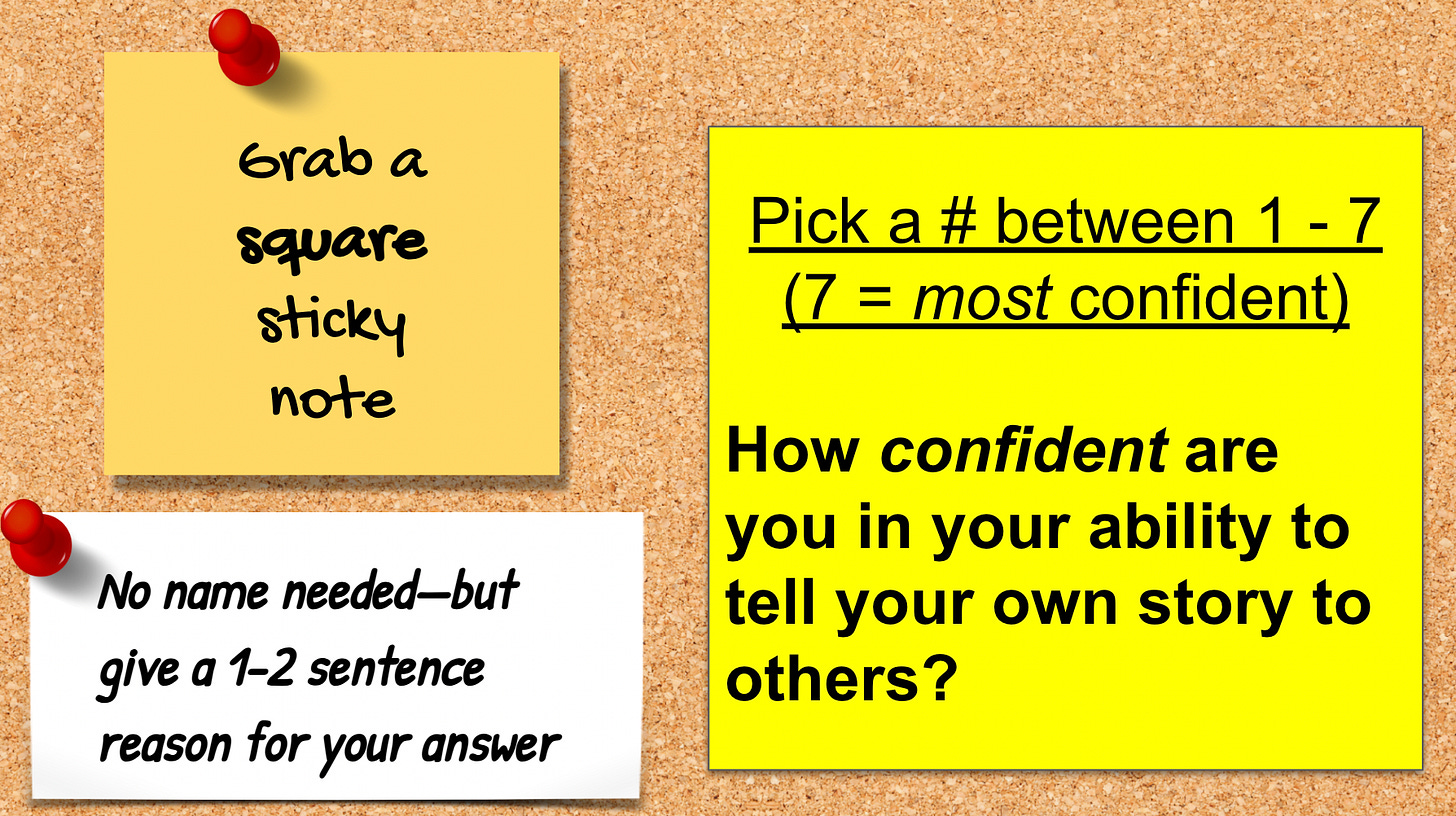 From there, we continued our conversation by shifting to the essential question our classroom will sit with individually and collectively throughout our upcoming unit as students explore Trevor Noah’s Born a Crime but also work to develop storytelling capacities themselves: how confident are you in your ability to tell your own story to others?