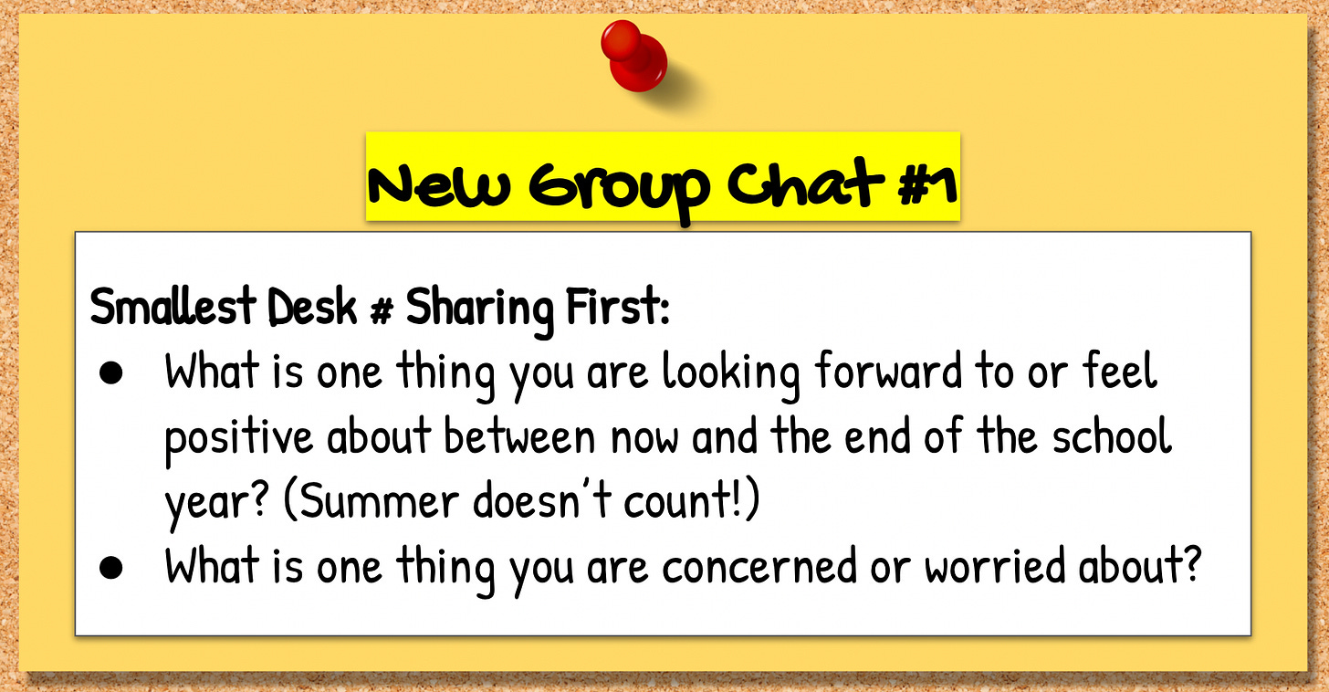 After the opening question around their feelings about the rest of the school year (see above), students were asked whether the school year up to this point had been more of a mirror year or a window year—giving me the opportunity to call on every student by name and have them share “mirror” or “window” before they returned back into their groups to debrief.