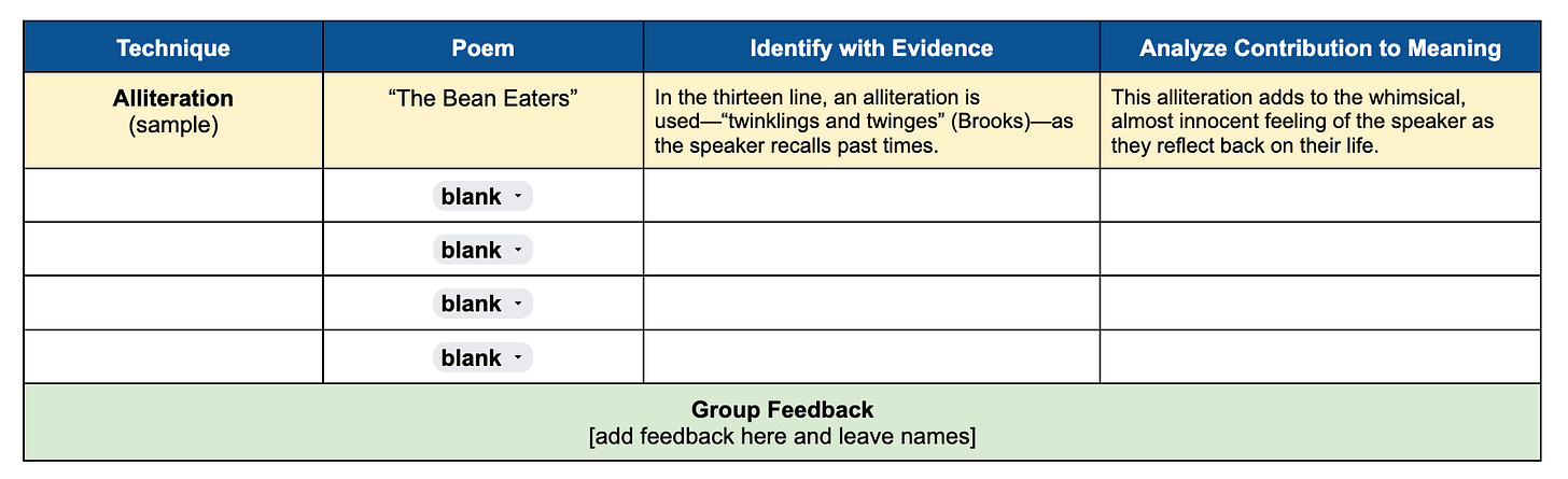 Context: this AP Literature course is full of juniors, with 30+ students in each section, and at this point we were in the middle of our poetry analysis unit—with their end-of-semester in-class essay coming just two weeks. Our focus before Winter Break had been more about strategies for annotating and interpreting poems, too, so in this final stretch I needed to shift to a priority around written analysis—and to make that shift quickly.