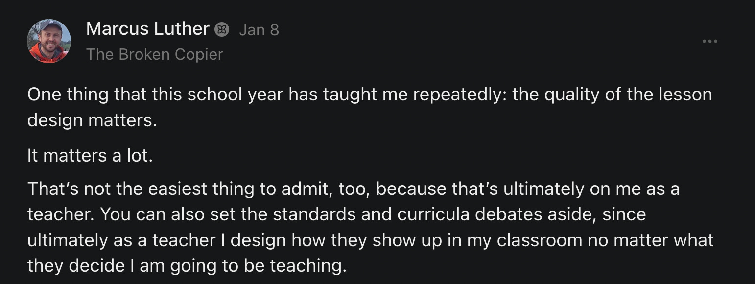 So many fancy papers, spreadsheets, and 300-page curricula can get in the way, and I really appreciate your clarity. Thanks also for the shoutout to my conversation with Tim! We need more of this dialogue and more voices like yours putting educators and researchers on equal footing.