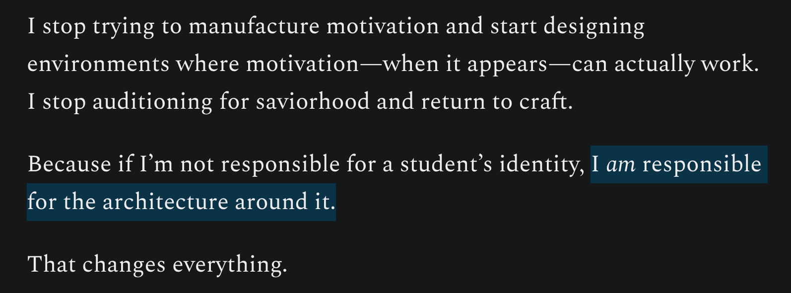 Matt Brady’s post this week that echoes this sentiment about the importance of lesson design: “Because if I’m not responsible for a student’s identity, I am responsible for the architecture around it.”